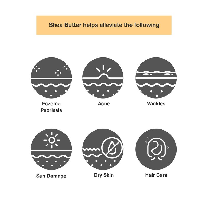 - Shea Butter helps alliviate the following : Eczema, Acne,Wrinkles, Hives, Diaper Rash, Psoriasis, Dry Skin, Stretch Marks, Sun Damage, Skin Rashes, Cracked Heels & Hands