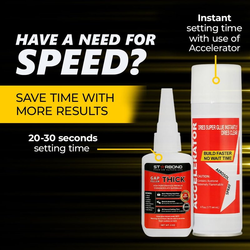 Starbond Thick is a thick viscosity CA glue. The gap filler cyanoacrylate glue fills large voids and gaps. A single drop of thick super glue remains stationary when applied on angled downward sloping surfaces. Curing time is extended for extra positioning time to ensure precise bonding. Depending on the surface type, bonding time may exceed longer than two minutes. In such instances, Starbond Accelerator is recommended to speed up bonding time.