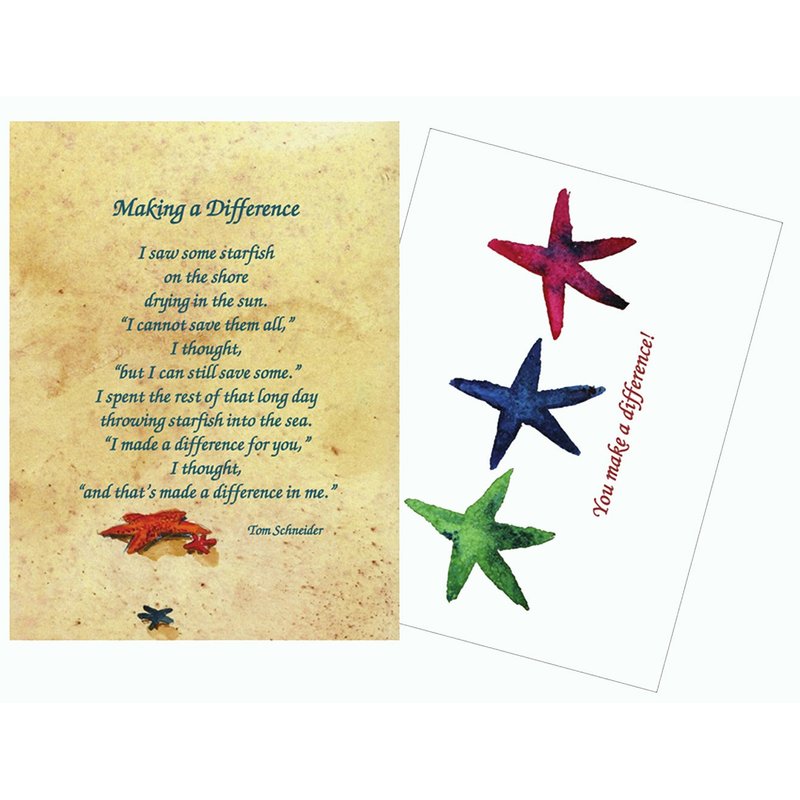 The front side of each card features a fresh, original retelling of the familiar starfish story about making a difference to some even if you can’t help everyone. The back side features three colorful starfish with the encouraging words “You make a difference.” Each card is laminated for durability and beauty.