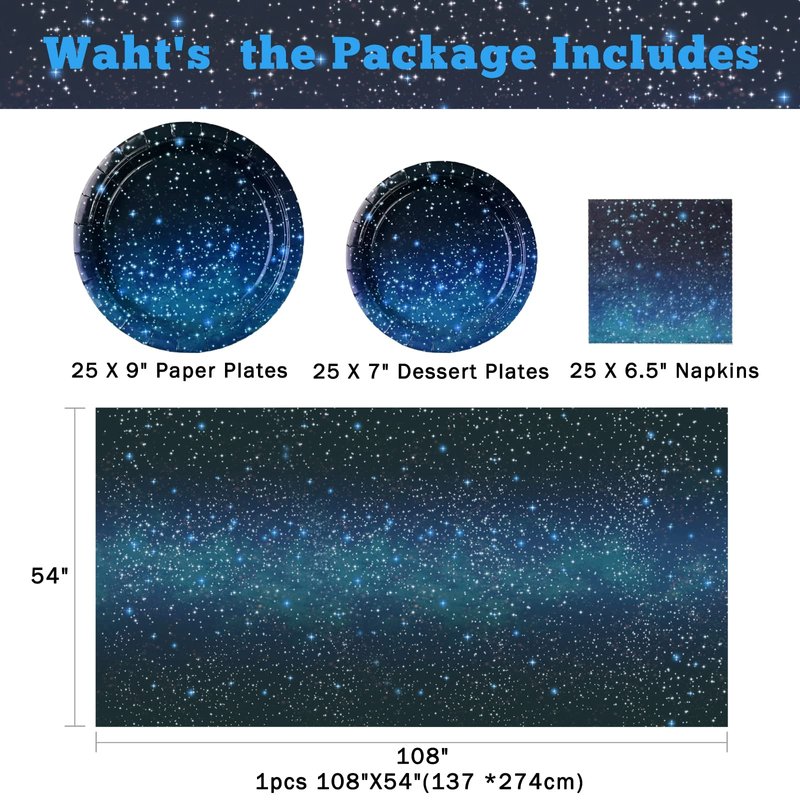 - 1.【Package Includes】:Our night sky party tableware set will serve 25 guests,including 25 paper galaxy plates of 9 inch,25 space dessert plates of 7 inch,25 galaxy napkins of 6.5 inch,1pcs galaxy planet tablecloths 54 x 108 inches