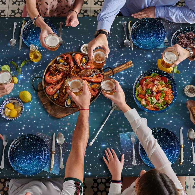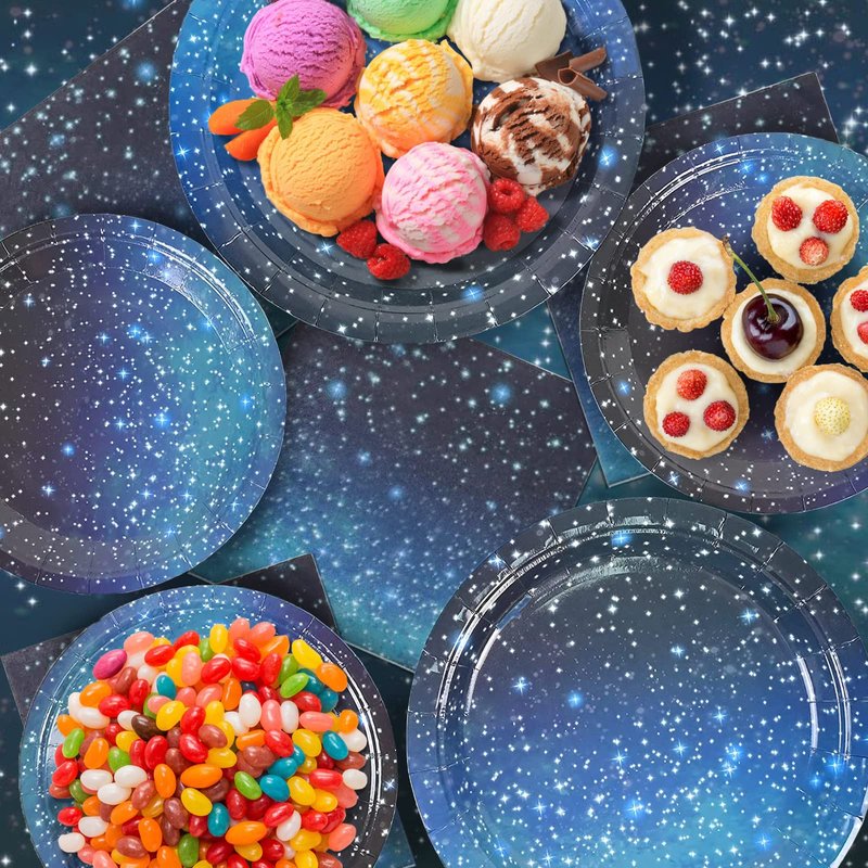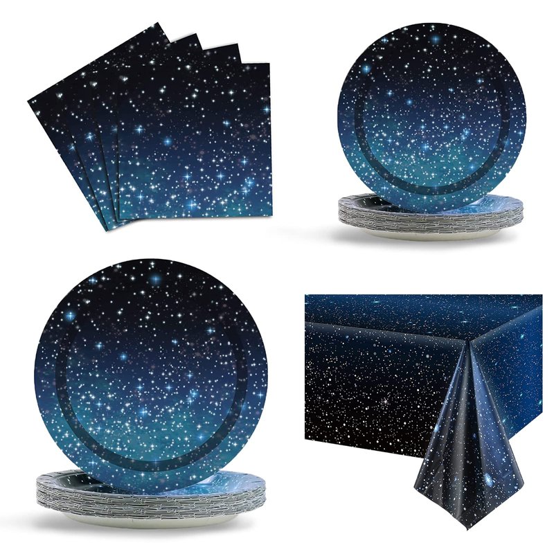 - 2.【Vibrant Space Party Design】:This galaxy theme party tableware set is all designed in blue starry sky theme pattern,full of starry sky theme party atmosphere,which is clear and exquisite,and can match well with your party ornaments,making your home and party more beautiful and attractive,creating a dreamy starry sky atmosphere