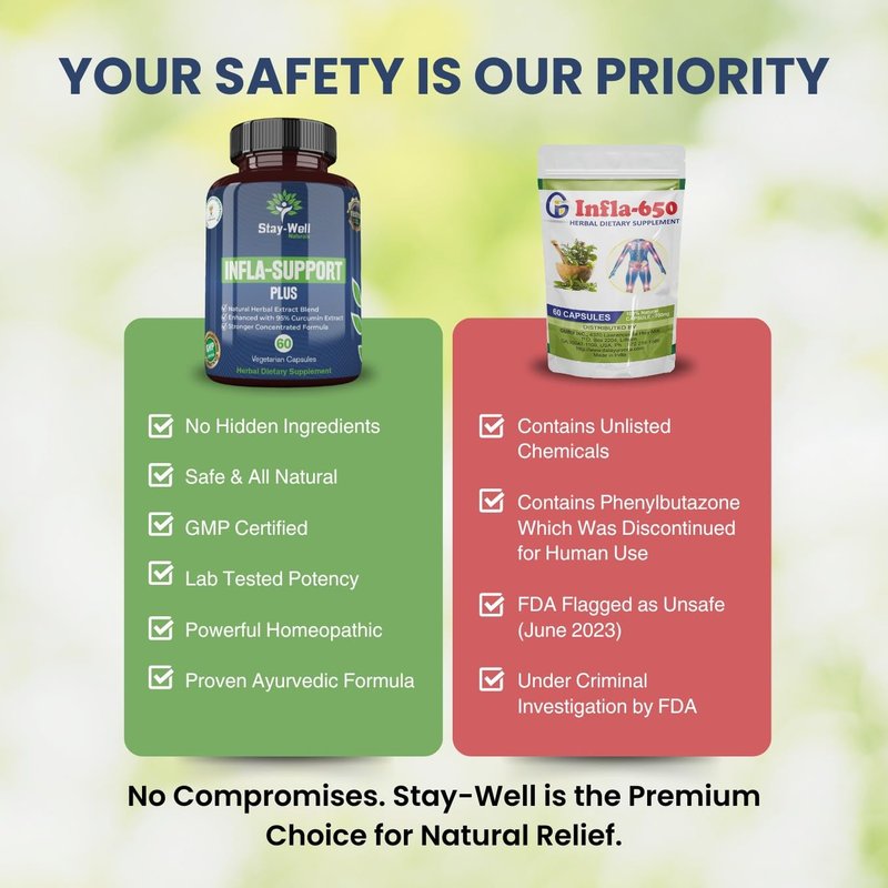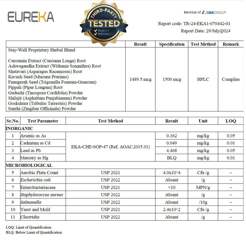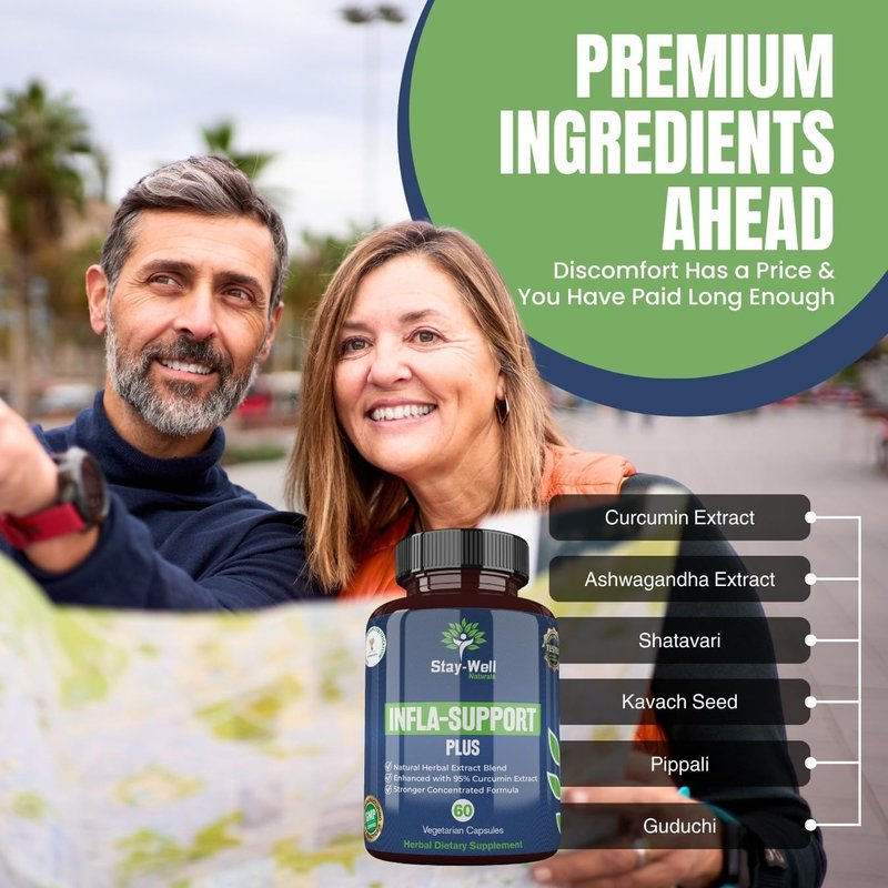 Stay-Well Naturals Infla-Support Plus- 750mg Herbal Supplement Blend with Curcumin and Ashwagadha Extract, Shatavari, Kavach, Fenugreek, Pippali, Guduchi, Shilajit, Goshura and Sunthi 60ct