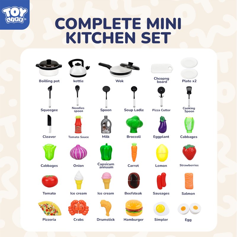 What you get: 3 X Cookware - pot, pan, kettle. 6 X Cooking Utensils, 1 X Chopping board, 1 x Plastic Knife, 2 X Plates, 2 X ice creams, 2 x ketchup, 2 X salmons, 2 X hot dogs, 2 X cabbages, 2 slices of pizzas, 1 x milk, steak, hamburger, crab, drumstick, eggplant, carrot, broccoli, potato, strawberry, lemon, tomato, fried egg, boiled egg, pea, onion.