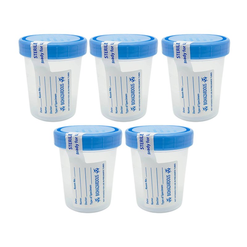 Introducing our versatile Sterile Specimen Cups with Lids, designed to provide a reliable solution for collecting and storing various types of samples, including urine, stool, and semen. Each 4-ounce cup is made from healthcare-grade plastic material, ensuring durability and cleanliness. The leak-proof screw-on lids secure your samples during transport, while the individually wrapped packaging guarantees sterility for each cup. These specimen cups also come with a patient details sticker to help you keep track of important information. Our collection containers are ideal for use in both home and professional settings such as doctors' offices, clinics, and hospitals. Choose the pack size that suits your needs and experience the convenience and reliability of our Sterile Specimen Cups.