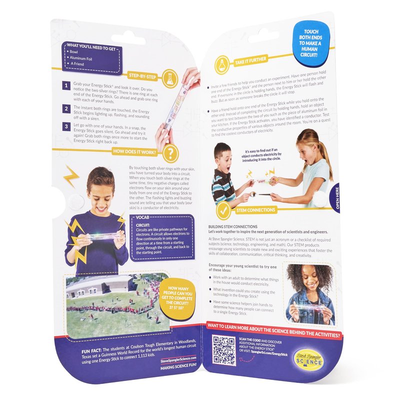 - HANDS-ON STEM SCIENCE: The Steve Spangler Science Energy Stick is a one-of-a-kind toy to learn and explore the science of electricity and circuits by putting the power in kids’ hands & turning their body into a human conductor of electricity