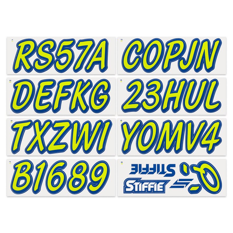 The STIFFIE Whipline Solid Alpha Numeric Identification Kit is a spin off of our premiere and best-selling Alpha Numeric Identification Kit. This is βtheβ registration decal that has set the standard for the 20+ years that it has been available on the market. This two-color registration decal features a flowing brush stroke look with a rounded cursive font type. The characters all slant forward but unlike the standard Whipline design, there is no exterior color fade in. The solid interior makes it easier to read and possibly a cleaner overall look. The exterior outline color is heavy which allows for character over lapping, enabling you to create a unified, custom look like never before. STIFFIE decals are made to match your OEM Boat, Marine Vessel or Personal Watercraft using our COLOR CLONE print system.
