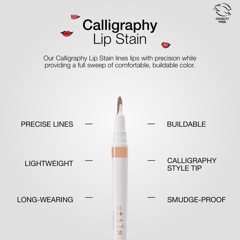 - PRECISE LINES: Our double-duty Calligraphy Lip Stain lines lips with precision while providing a full sweep of soft buildable color and provides 8-hours of continuous wear. This non-drying, lightweight formula stays on throughout the day, subtly fading to a natural wash of color.