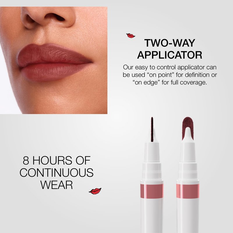 - CALLIGRAPHY STYLE TIP: Calligraphy-style pen has a unique easy-to-control two-way applicator for lining the lips and depositing lasting color. Can be used “on point” for definition or “on edge” for full coverage. This smudge-proof, vegan formula is transfer-proof and doesn't feather or bleed.