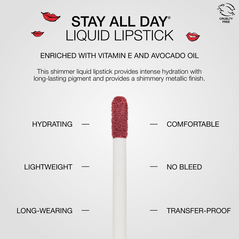 - SHIMMER FINISH: This creamy, full-coverage liquid lipstick provides intense hydration with long-lasting pigment. Our Stay All Day lipstick provides a shimmery metallic finish and stays put for up to 12 hours of continuous wear.