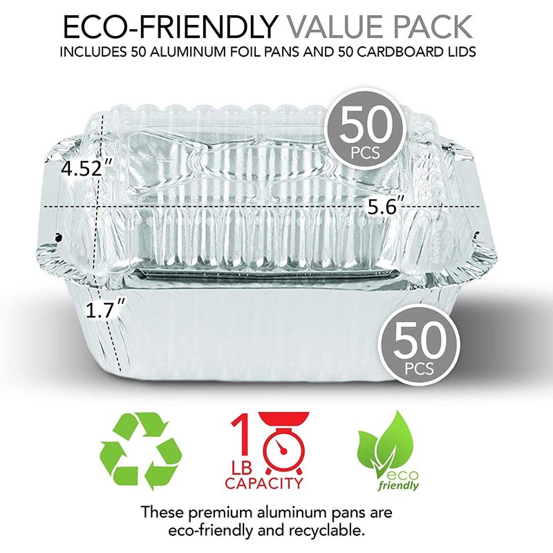 - Great Value Pack: Comes with 50 1-lb aluminum foil pans and 50 clear plastic lids. Dimensions: 1 ¾” Height, 4 ⅛” Bottom Length, 3 ⅛” Bottom Width, 5 ⅛” Top Length, 4 ⅛” Top Width. Lid: ¾” Height, 5 ½” Length, 4 9/16” Width.