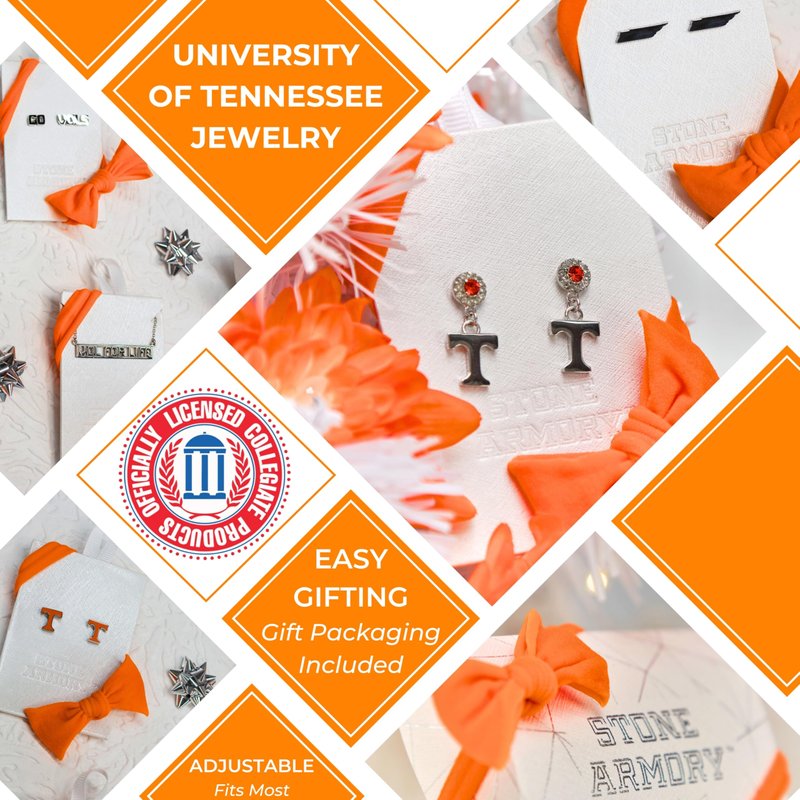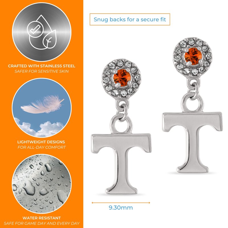 • Treasure Your Tennessee Vols Spirit - These University of Tennessee earrings are full of Volunteer pride; featuring a stainless steel Power T pendant dangling from Tennessee orange and clear crystals, these classic Vols earrings are just as unique as you