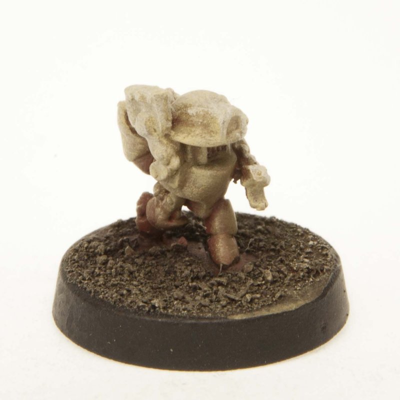Please note, some base tabs on the miniature may not fit perfectly to the base. To resolve this, you can simply bend the base tab into a shallow -V- so it touches each side of the base slot. Then drip a small amount of superglue onto each point that the tab contacts to the base. To cover the open areas of the base slot, you can glue in small pieces of construction paper over them. To give the base a more natural look, you can spread craft glue over the whole base and dip in in some dirt or sand from your yard for a gravel texture.