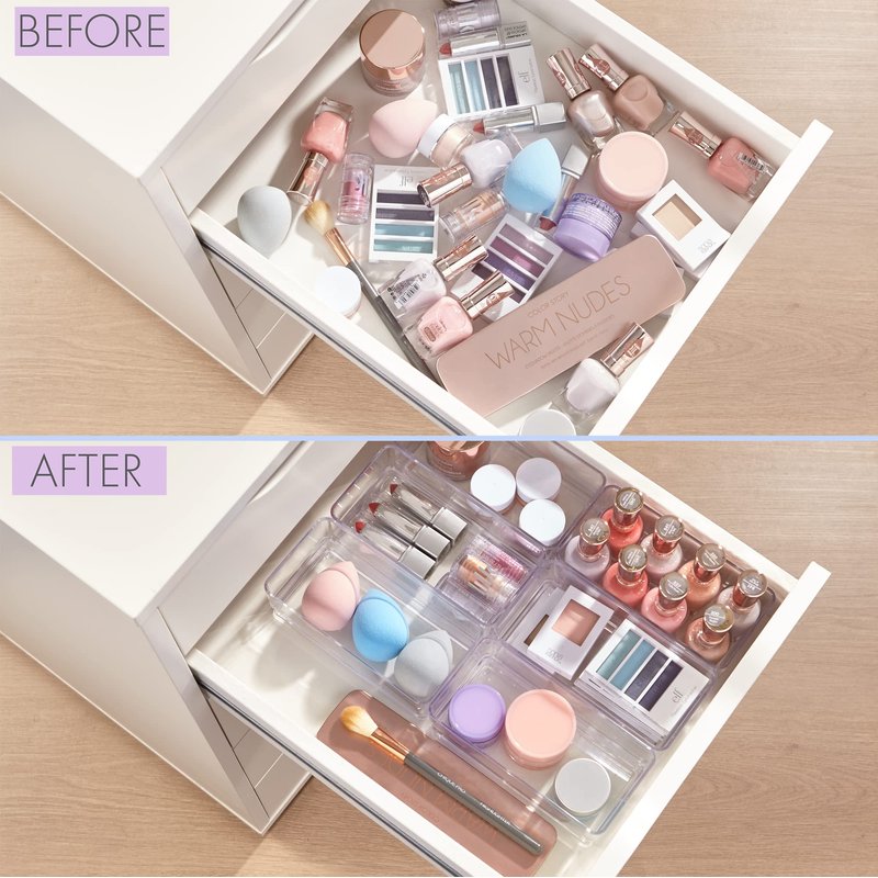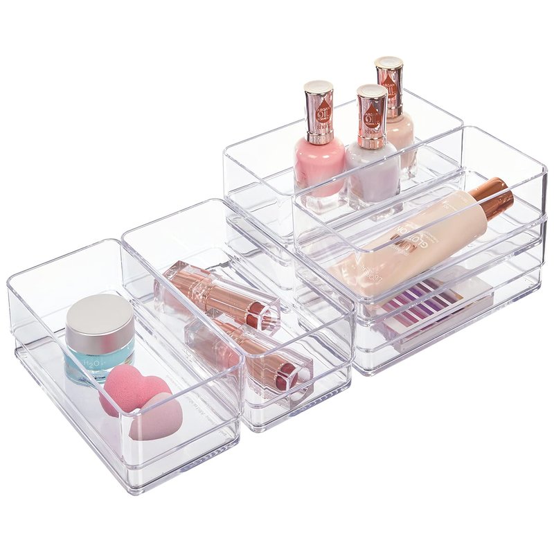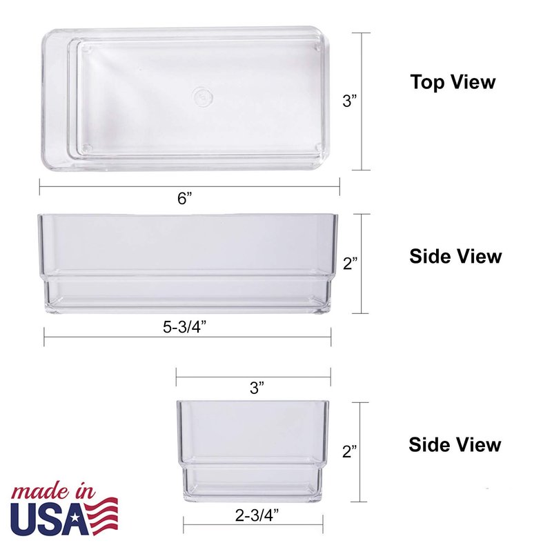 Time to get your drawers organized! With many applications and configurations, these individual organizers can fit side by side to sort daily essentials in your drawers! Each container easily stacks for multiple layers of storage. Great for deep drawers! Purchase additional sizes to customize your organizational needs. Create modular sets to organize drawers in your entire house. Clear, break-resistant plastic fits in any décor. No assembly required. Cleans easily with mild soap and warm water. Made in USA.