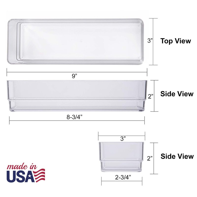 Time to get your drawers organized! With many applications and configurations, these individual organizers can fit side by side to divide and contain all of your desk clutter. Perfect to keep cosmetics organized in your vanity and bathroom drawers! Also great for craft, office, and kitchen drawers. Each of the containers can stack on top of each other allowing for easy access to items below. Great for deep drawers! Purchase additional sizes to customize your organizational needs. Create modular sets to fit a multitude of items. Clear break-resistant plastic fits in any decor. Accessories shown are not included. No assembly required. Cleans easily with mild soap and warm water. Made in USA.