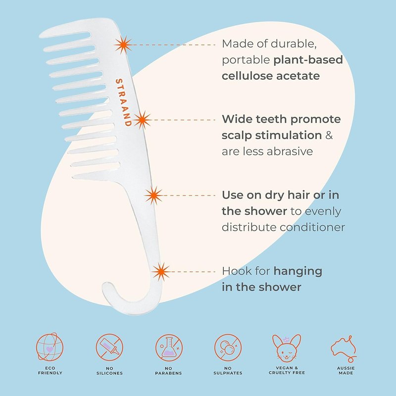 - Style and Detangle with Ease - This wide tooth comb is designed to easily distribute your favorite hair mask or conditioner throughout your Straands. Suitable for all types, including curly hair, our detangling comb is the perfect addition to your in-shower hair routine.