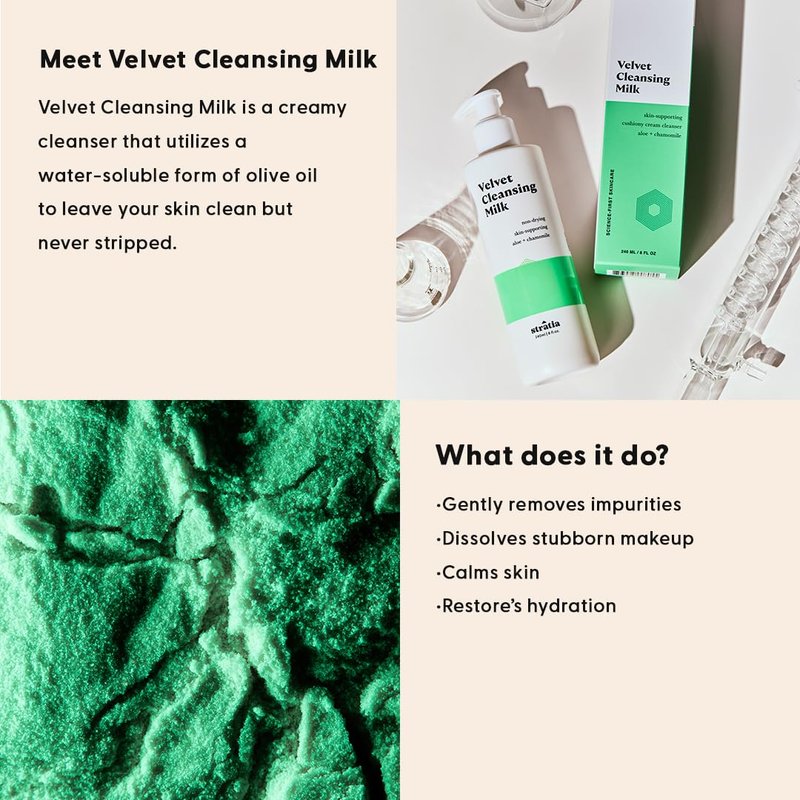 Stratia Velvet Cleansing Milk | Gentle Cream Face Cleanser | Moisturizing, Non-Foaming | Chamomile, Olive Oil & Aloe Vera | 4 Fl Oz