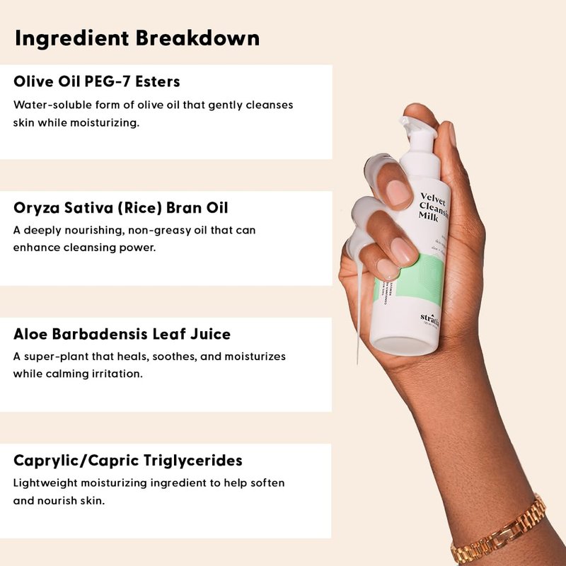 Refresh your skin with Stratia's moisturizing, non-foaming cleanser that gently removes makeup, dirt and grime without damaging your skin’s natural barrier. Velvet Cleansing Milk is a creamy cleanser that utilizes a water-soluble form of olive oil to leave your skin clean but never stripped.