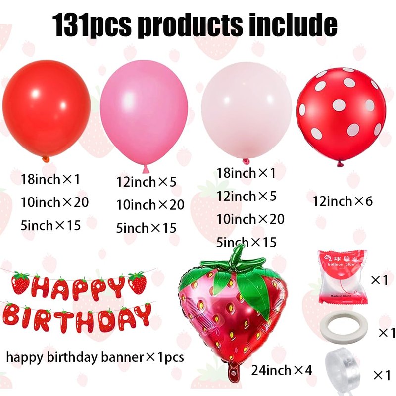 - [Cute Foil Strawberry Balloons set]: This Strawberry balloons set includes 131pcs latex balloons (color in Red,pink,pastel pink,red with white polka dot balloons.Size in 5inch, 10inch,12inch,18inch, with 4 pc Strawberry foil balloons ), with a Strawberry Happy Birthday Banner , 3pcs balloon arch accessories. Glue dots,ribbons,arch strip for DIY Balloon arch kit.