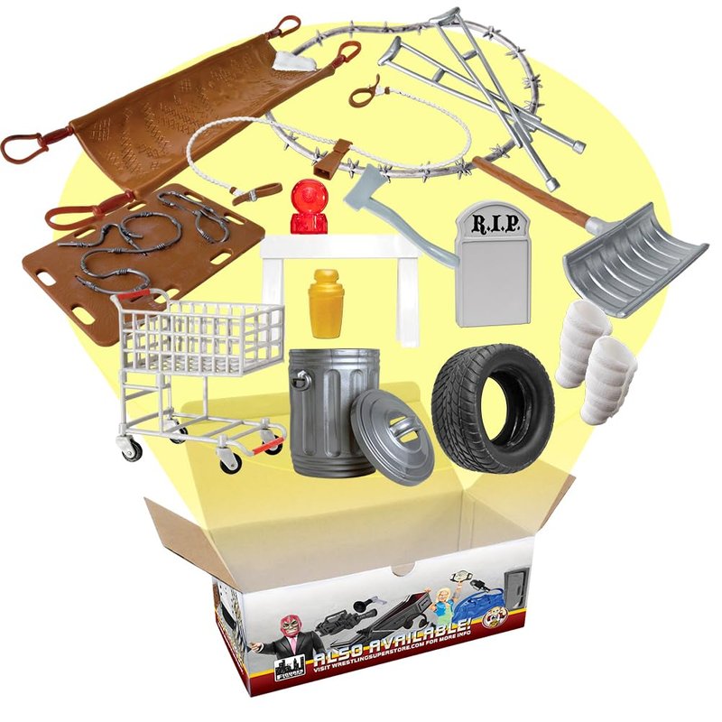 Bring the chaos of a street fight to your wrestling action figure matches with the Street Fight Match Accessory Set. This set includes a shopping cart, a wooden board with barbed wire, a stretcher, a cowbell rope, barbed wire, a trash can, an urn, a street barrier, an ax, a tombstone, crutches, a snow shovel, a tire, and 2 leg casts. Perfect for recreating gritty, no-holds-barred brawls, these accessories add realism and intensity to your figure matches. Whether your figures are battling it out in the streets or preparing for a hardcore match, this set provides all the tools needed to create epic and unforgettable segments! Compatible with all wrestling action figures. Also a good scale for other 6-8 inch action figures.