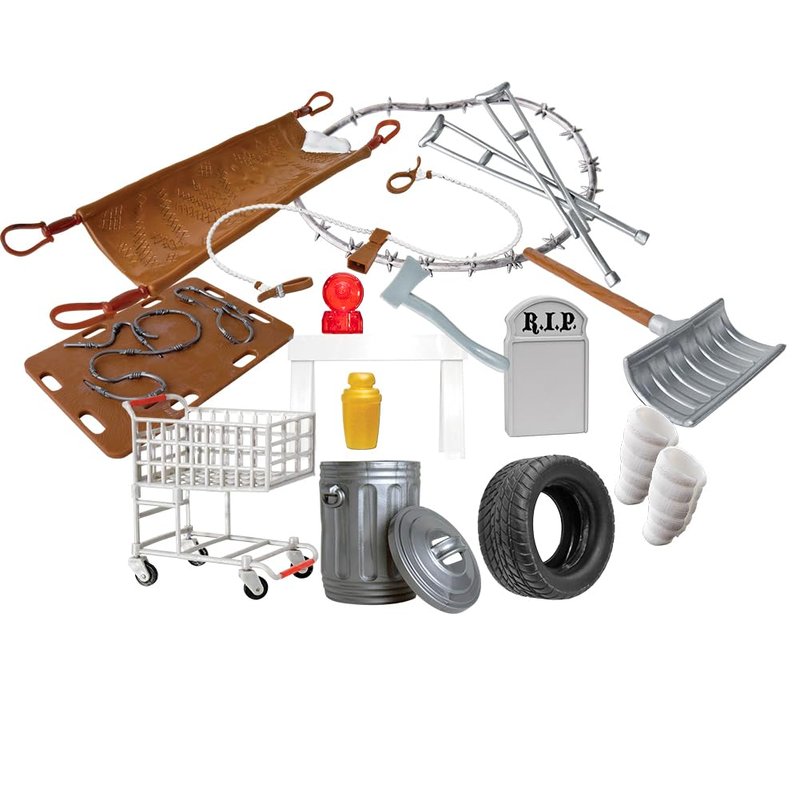 - This set includes a shopping cart, a wooden board with barbed wire, a stretcher, a cowbell rope, barbed wire, a trash can, an urn, a street barrier, an ax, a tombstone, crutches, a snow shovel, a tire, and 2 leg casts.
