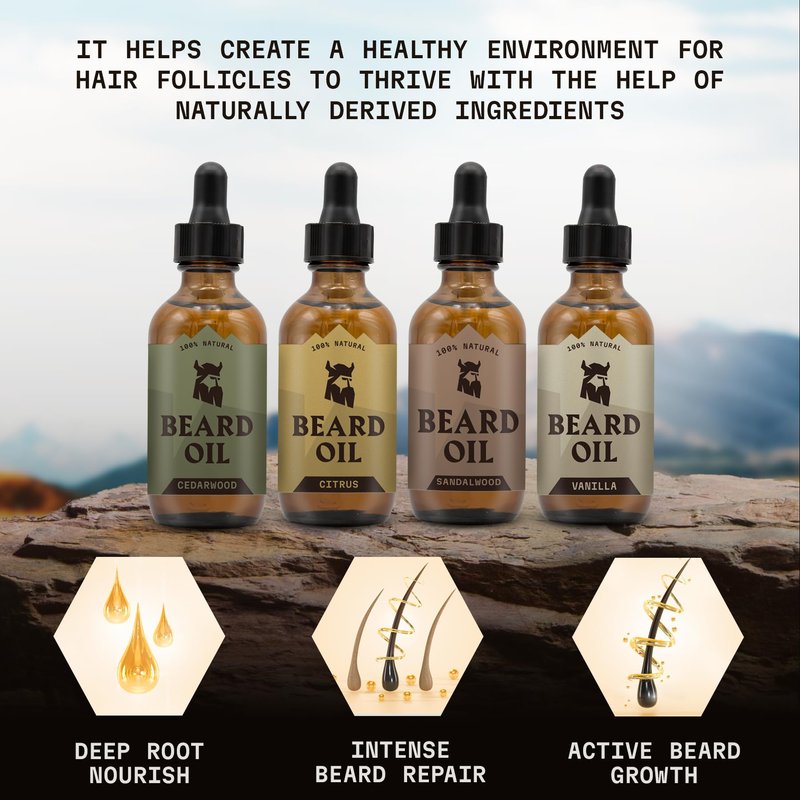 A Healthy Beard Has To Be Cultivated! Any man who has ever tried growing a beard can tell you, it requires much more than just letting the hair grow on your face. It takes patience, responsibility and care. That’s where Striking Viking Beard Oil comes in. Our beard care oil eases the process by softening your beard and restoring the natural moisture to the underlying skin, which adds luster and shine and reduces itchiness and irritation! Our men's beard oil are handcrafted with all natural and 100% organic ingredients which are easily absorbed, leaving your beard and mustache full and healthy. Our unique beard oil conditioner blend is specially formulated to promote beard growth, tame wild beard hairs and make your beard softer to the touch. Your beard will look and feel healthier all year long! Your beard deserves the best, order your Striking Viking Beard Oil for men today!