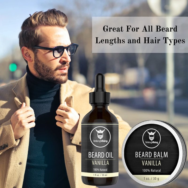 Striking Viking is a Kentucky-based brand that focuses on providing innovative and affordable men’s grooming products which are meant to make your everyday life easier, without compromising on style or comfort. We rely only on carefully selected, organic and natural ingredients and trustworthy suppliers, in order to live up to your rigorous expectations. Keep your beard in check day-in and day-out! Get the tools you need to style, moisturize and do anything else your beard needs to look and smell great! Our beard oil uses natural ingredients to make your beard stay strong, healthy, and soft while our beard balm keeps your beard styled and looking its best. Designed to provide styling and protection for your hair, our beard balm and oil for men make the perfect gift for the bearded friend or family in your life. Deluxe Beard Oil and Beard Balm Kit -Wonderful Scent, Intense Hydration and Easy Styling The Striking Viking mens beard oil and beard balm is a perfect choice for the modern man on the go who understands the importance of looking his best, no matter where the day takes him. Made using finest quality natural extracts, packed with essential skin and hair nutrients that promote stronger and thicker hair growth, this mens beard grooming set leaves behind a delightful vanilla scent, with a properly moisturized skin and easy to arrange beard that requires minimal effort to maintain! Here are some of the amazing features of this beard care kit for men: Set includes: 1 x 1fl oz beard oil, 1 x 1oz beard balm; Pampering sensation with long-lasting vanilla scent; Easy to apply, non-greasy, no stains; Ultra-shiny beard, promotes growth, restores healthy and strong appearance; Helps eliminate itchiness, dandruff, great for the skin Natural and organic ingredients, no nasty preservatives, parabens, sulphates; Original beard gift for husband for best friend, best man, colleague, boyfriend, Father’s Day, or other special occasions.