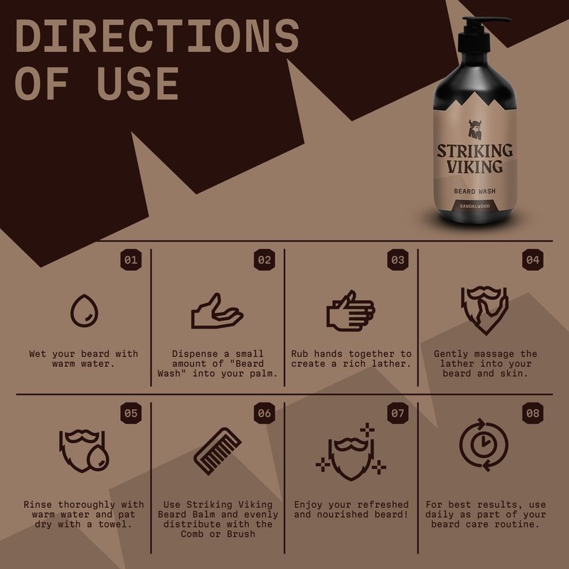 - How to Use it: Wet your beard with warm water, Apply a small amount of Beard Wash on your fingertips, and then massage it into your beard & skin in a circular motion. Rinse your Beard thoroughly with warm water to remove the Beard Shampoo. And after that gently pat your beard with a towel. After that, you can use Striking Vikings Beard Oil or Beard Balm depending on your choice.