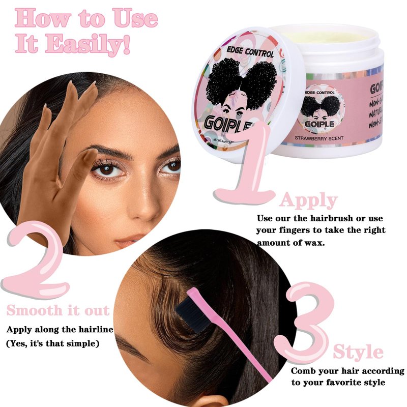 - 【Edge Control for Black Hair Set】This set included:1pc 4oz strawberry flavor edge control+1pc 2.7oz hair wax stick+1pc elastic bands for wig+1pc rail tall comb+1 pc double-sided edge brush+1pc bristle brush.The tool is ready!.