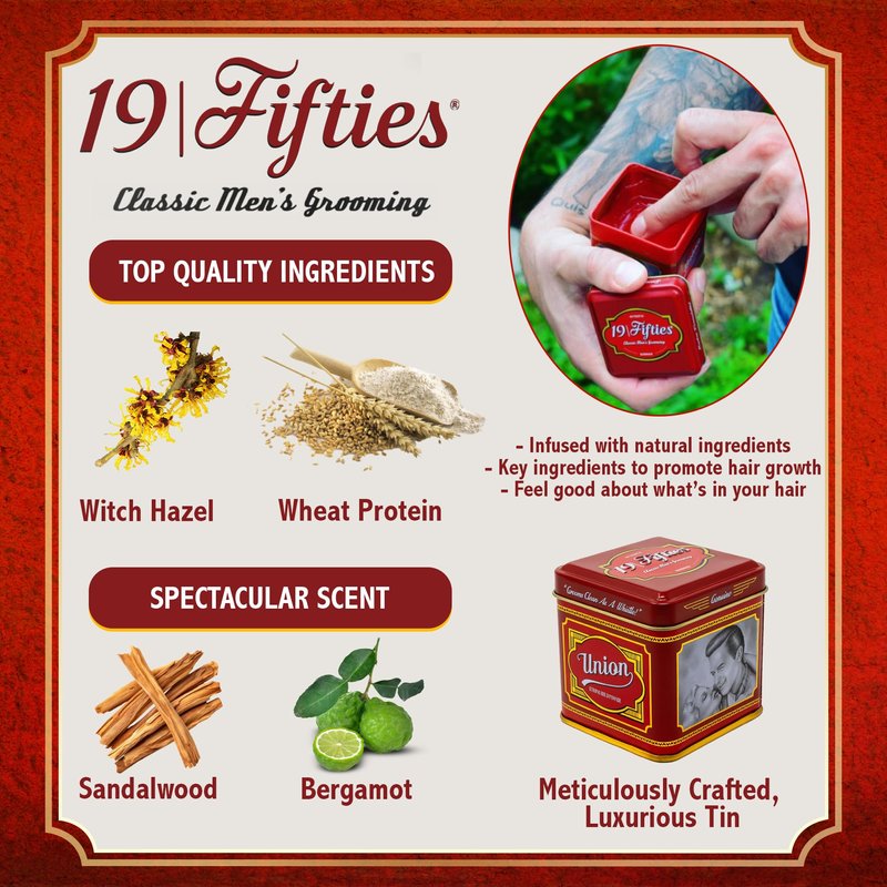 - ✔️METICULOUSLY CRAFTED TINS - Pomade comes in a luxurious, classic cube tin which includes metallic gold accents, embossed text, and “Buddy” The hand sketched illustration. Authentic 50’s charm.