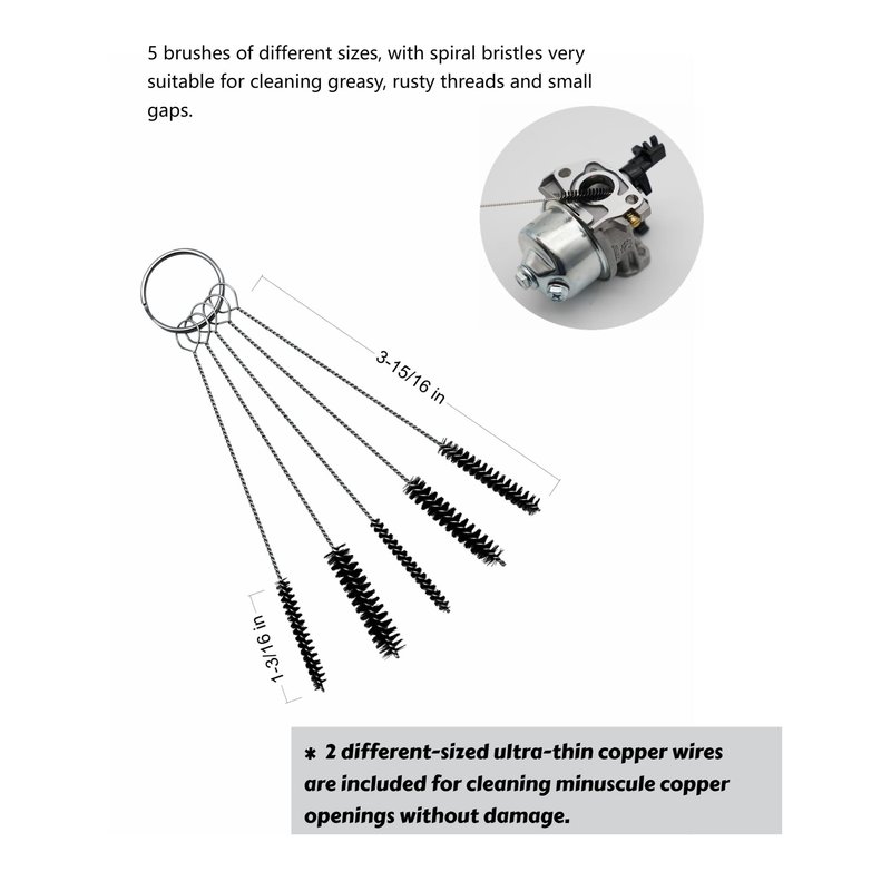 - A set of 5 small carburetor jet cleaning brushs come together with the the tool.