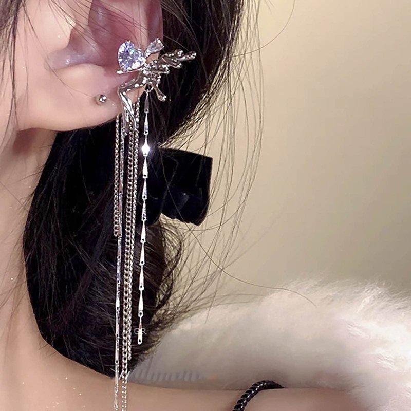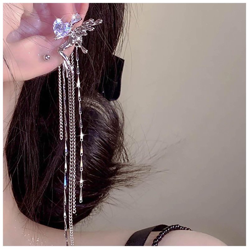 Sttiafay Vintage Angel Chain Ear Cuff Earrings Long Chain Tassel earrings Silver Crystal Cuff Wrap Earrings Angel Wing Cartilage Earrings Jewelry for Women(Left)