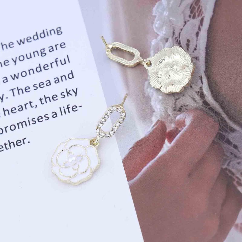 - White camellia flower earrings.Item Details:Handmade Item.Size:As Shown.Color:White.Materials:Quality Alloy/Crystal.Location:Ear.Style:Boho/Vintage.