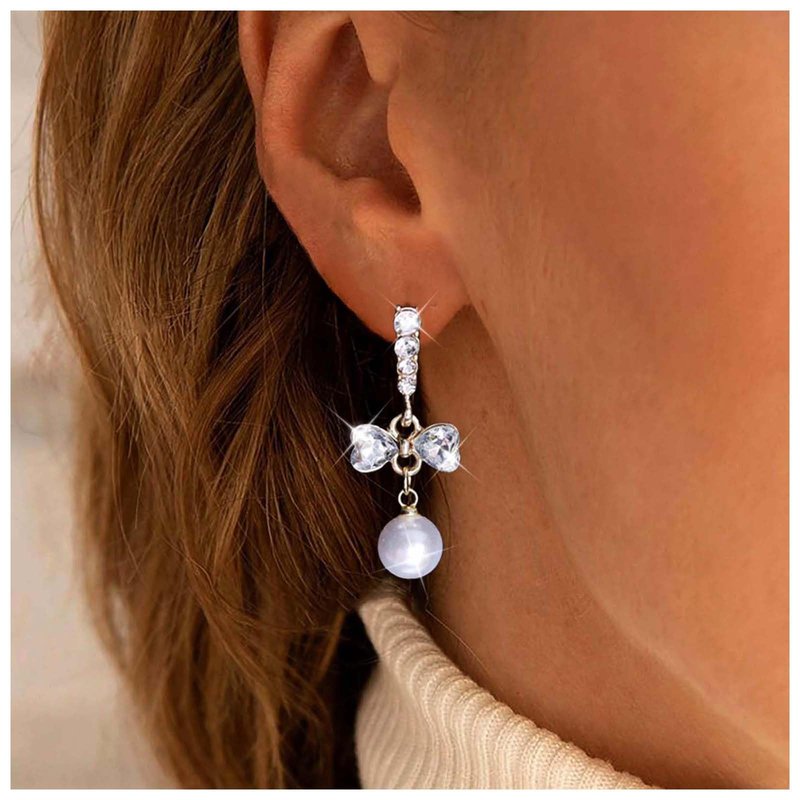 Sttiafay Vintage Crystal Pearl Dangle Earrings Rhinestone Bow Drop Earrings Cz Pearl Earrings Gold Pearl Bow Stud Earrings Jewelry for Women