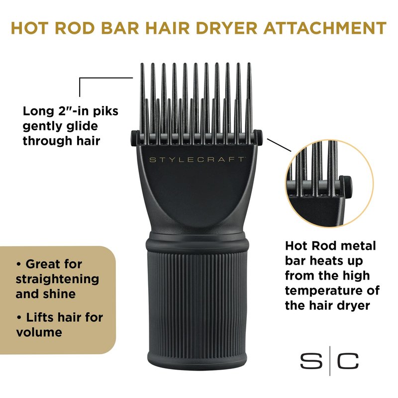 StyleCraft Hair Dryer Attachment Hair Pik with Hot Rod, Helps Straighten and Dry, Size 1.55-2 Inch Dryer Nozzles