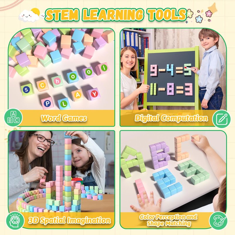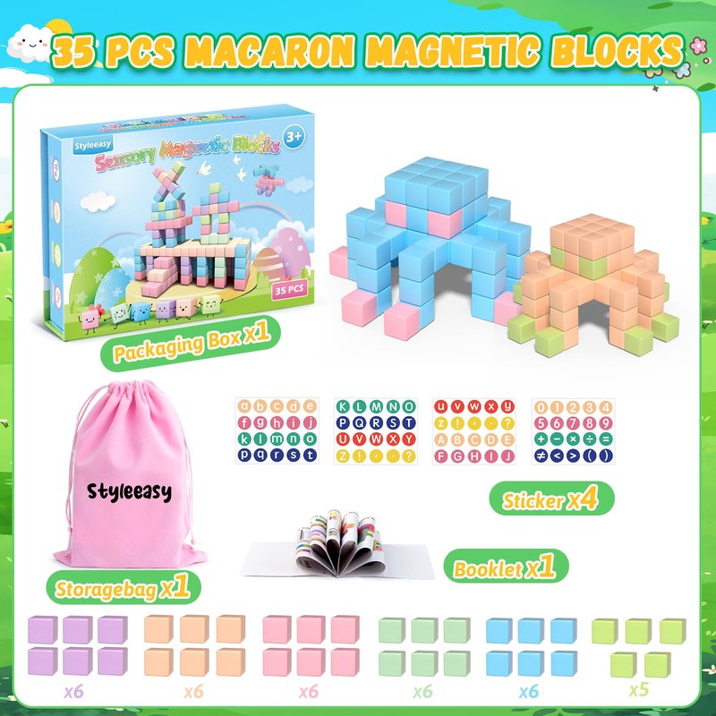 - 【35 PCS Macaron Magnetic Blocks】Our magnetic block set includes 35 magnetic cubes (0.98IN, 6 different macaron colors), a creative booklet, four stickers, a storage bag and a very cartoonish packaging box. Building blocks can not only activate children's vision and hearing, but also increase STEM knowledge. The manual contains many gameplay and learning methods, waiting for you to explore!