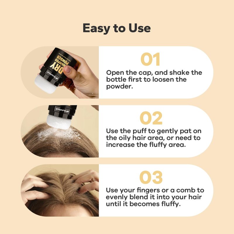 - Easy to Use: Simply unscrew the cap, remove the plastic seal, and shake the bottle. Lightly tap an appropriate amount of dry shampoo powder on the oily scalp and areas that need more volume. Then, use your fingers or a comb to evenly blend it into your hair until it becomes fluffy.