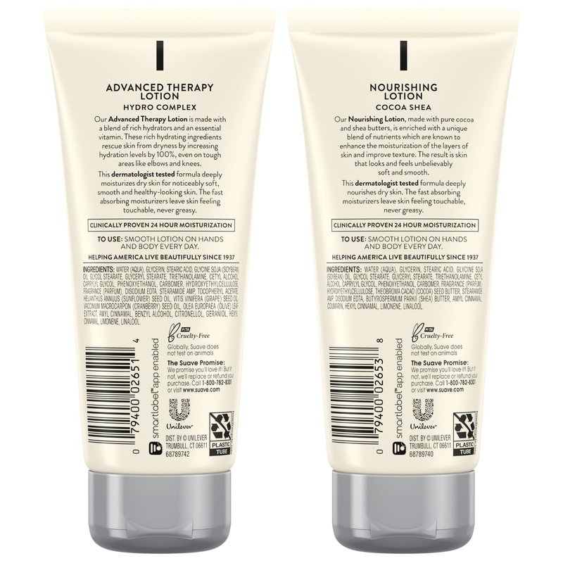 Suave Lotion Variety Pack – Advanced Therapy Hydro Complex & Nourishing Lotion Cocoa Shea, Moisture-Rich Body Lotion for Extremely Dry Skin, 3 Oz Ea (2 Piece Set)