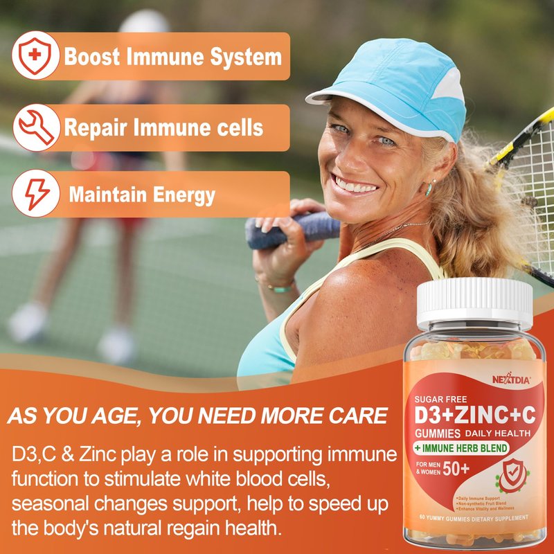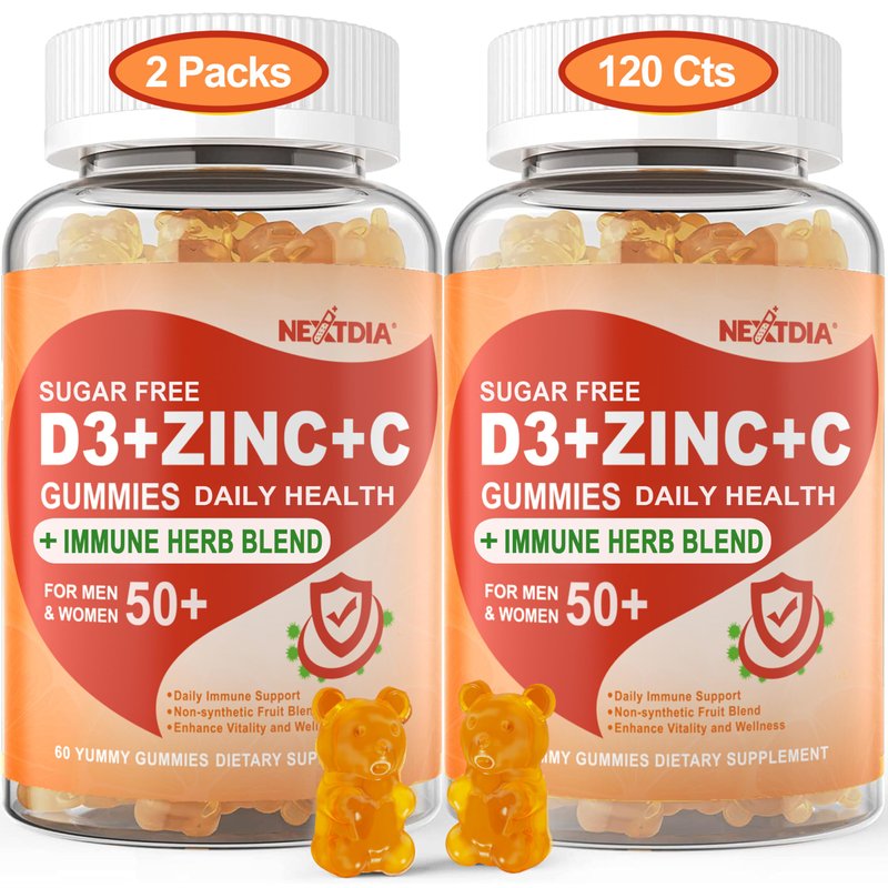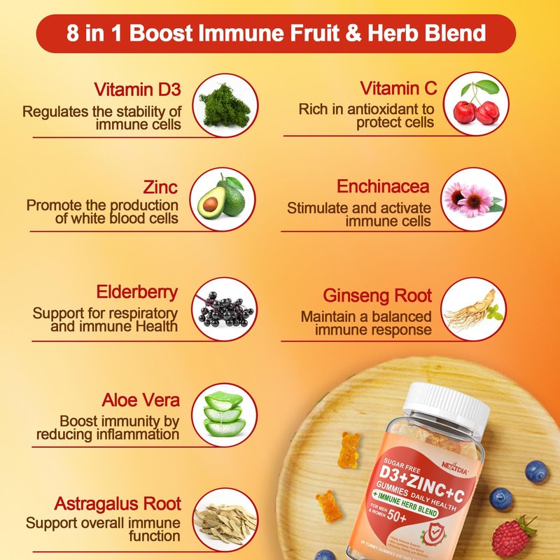 - 【Whole Plant Blend Immune Defense Gummies】Vitamin D3 and C Gummies contains per serving Vitamin D3 125mcg (5000IU), Zinc 20mg and Vitamin C, paired with 200mg immune herbal blend (Echinacea, Elderberry, Astragalus, Ginseng, Mullein and Aloe Vera). Using the power of nature to play a role in supporting immune function by stimulating white blood cells, seasonal changes support, helping to speed up the body’s natural regain of health. Nextdia Daily Immune Gummies let your family stay healthy.