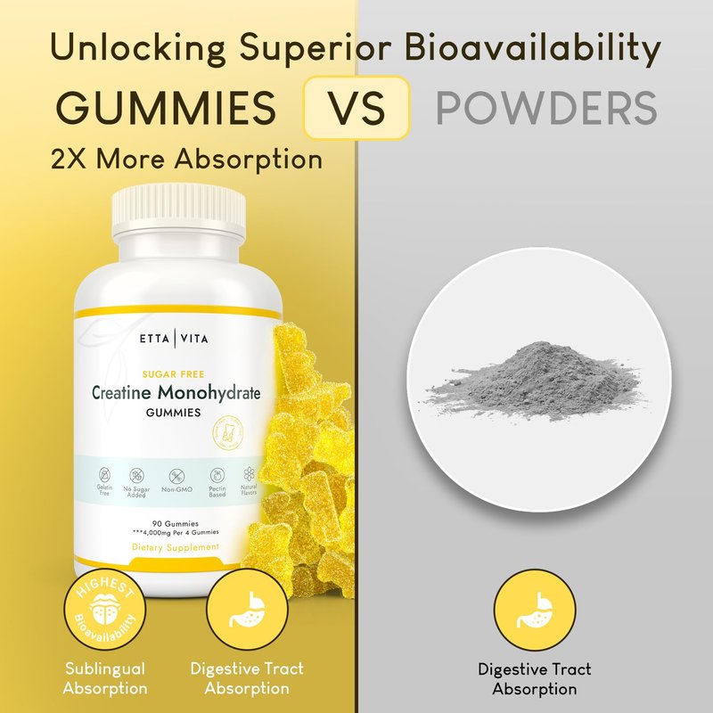 - [Efficient Muscle Fuel] Fuel your workouts like never before. Packed with potent creatine monohydrate, Etta Vita's creatine gummies help in promoting lean muscle growth, elevating athletic performance, improving high-intensity exercise capacity, enhancing muscle strength, and muscle recovery. These are effective creatine gummies for men and women.