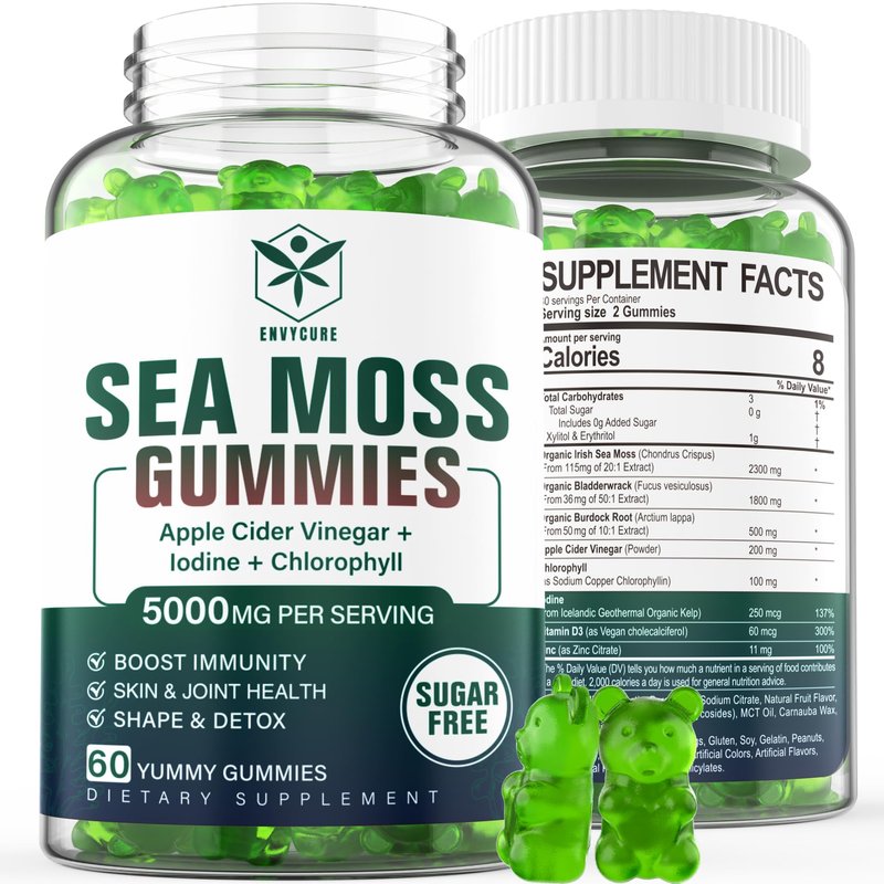 Sugar-Free Sea Moss Gummies 5000mg, Extra Strength Irish Moss Gel Supplement with Iodine, Chlorophyll, Unfiltered ACV, D3, Burdock Root, Bladderwrack for Immune, Digestive, Joint, Skin, Vegan 60 Chews
