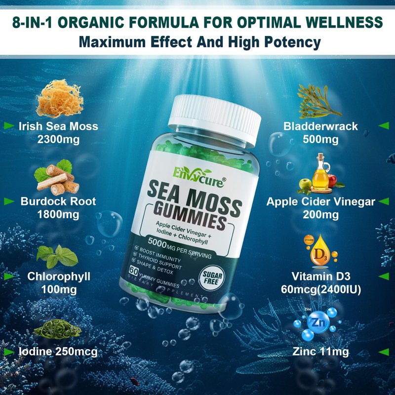 - 😘8 IN 1 High Potency Gummies: Superfood gummies rich in 102 essential vitamins& minerals and immune mixture to enhance the absorption of nutrients by 50%. Our sugar-free seamoss gummies have been crafted to combine with Irish Sea Moss from the coast of the North America, lodine, Burdock Root, Bladderwrack, Chlorophyll, Vitamin D3 and Unfiltered Apple Cider Vinegar. They are sweetened naturally, without any added sugar, making them a healthier alternative to traditional gummies.