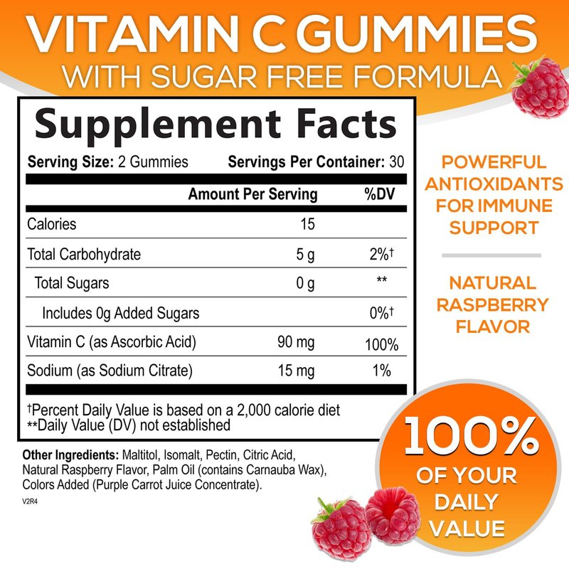 Sugar Free Vitamin C Gummies - Immune Support & Antioxidant Vitamin Dietary Supplement - Vegan, Non-GMO, Dairy & Gluten Free C Gummy Vitamins - Raspberry Flavor for Kids & Adults - 60 Count Gummies