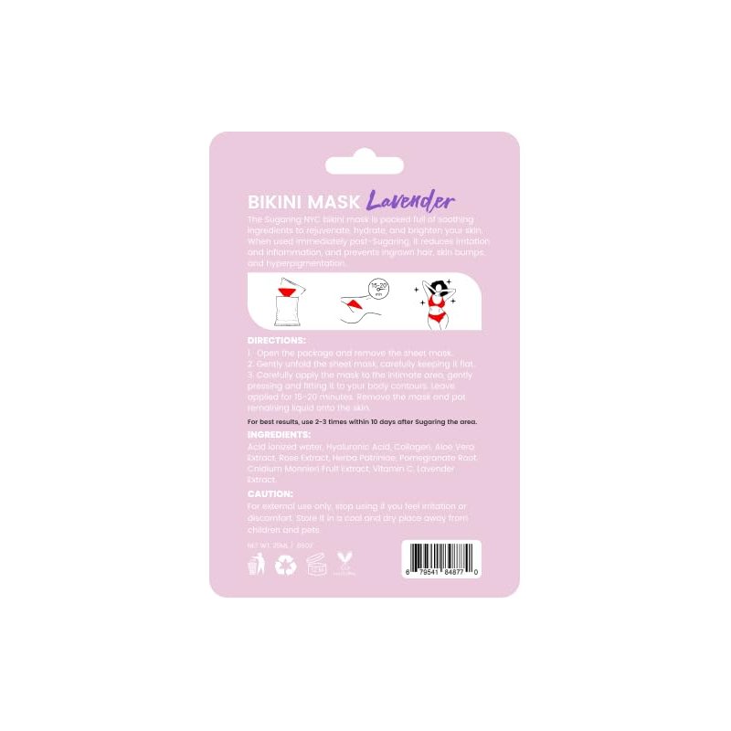 The Sugaring NYC bikini mask is packed full of soothing ingredients to rejuvenate, hydrate, and brighten your skin. When used immediately post-Sugaring, it reduces irritation and inflammation and prevents ingrown hair, skin bumps, and hyperpigmentation. DIRECTIONS 1. Open the package and remove the sheet mask. 2. Gently unfold the sheet mask, carefully keeping it flat. 3. Carefully apply the mask to the intimate area, gently pressing and fitting it to your body contours. Leave applied for 15-20 minutes. Remove the mask and pat the remaining liquid onto the skin. For best results, use 2-3 times within 10 days after Sugaring the area. INGREDIENTS Acid ionized water, Hyaluronic Acid, Collagen, Aloe Vera Extract, Rose Extract, Herba Patriniae, Pomegranate Root, Cnidium Monnieri Fruit Extract, Vitamin C, Lavender Extract.