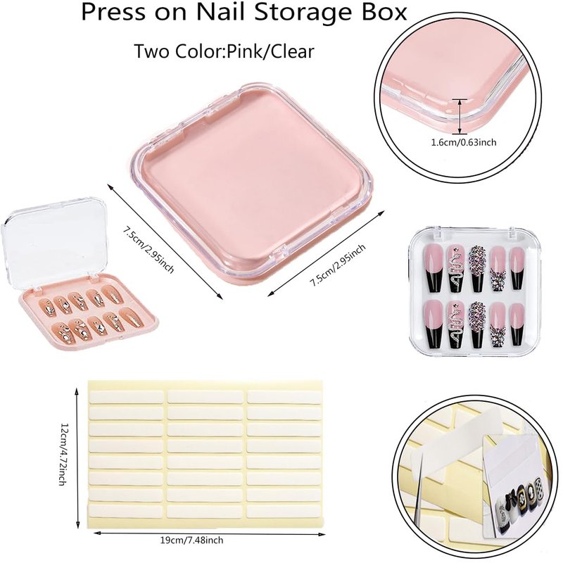 SUKPSY 4pcs Plastic Press on Nail Storage Box with Adhesive Double Sided Tape Fake Nail Display Storage Box Acrylic Nail Packaging Box for Nail Salon Home Storage Supplies(Pink/Clear)