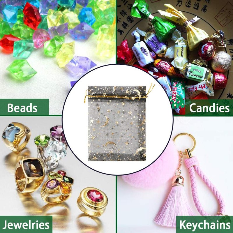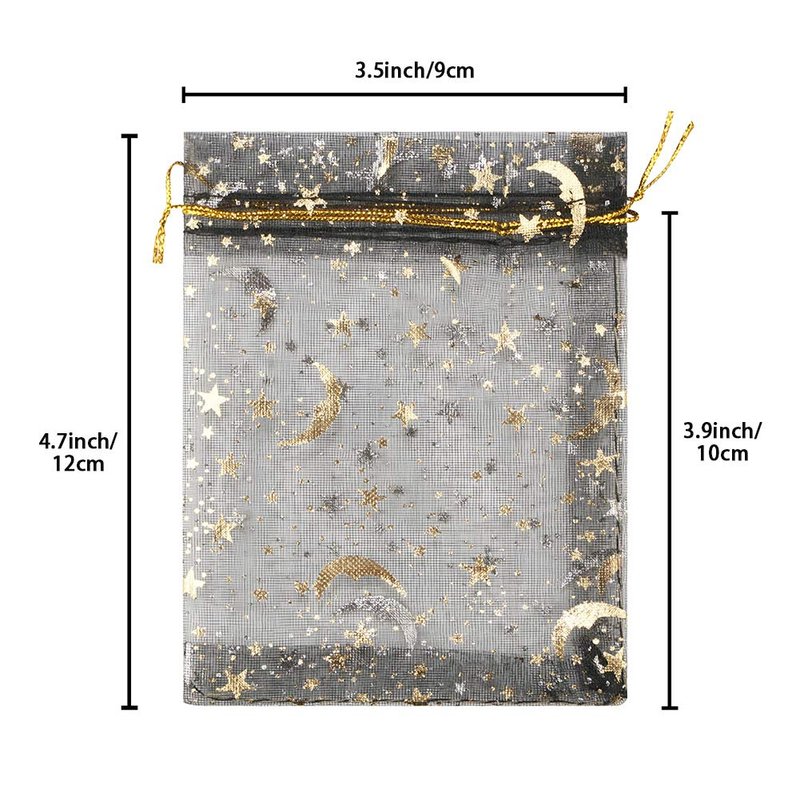 Package Includes:120 Pcs mixed color drawstring organza bags with gold star moon print.