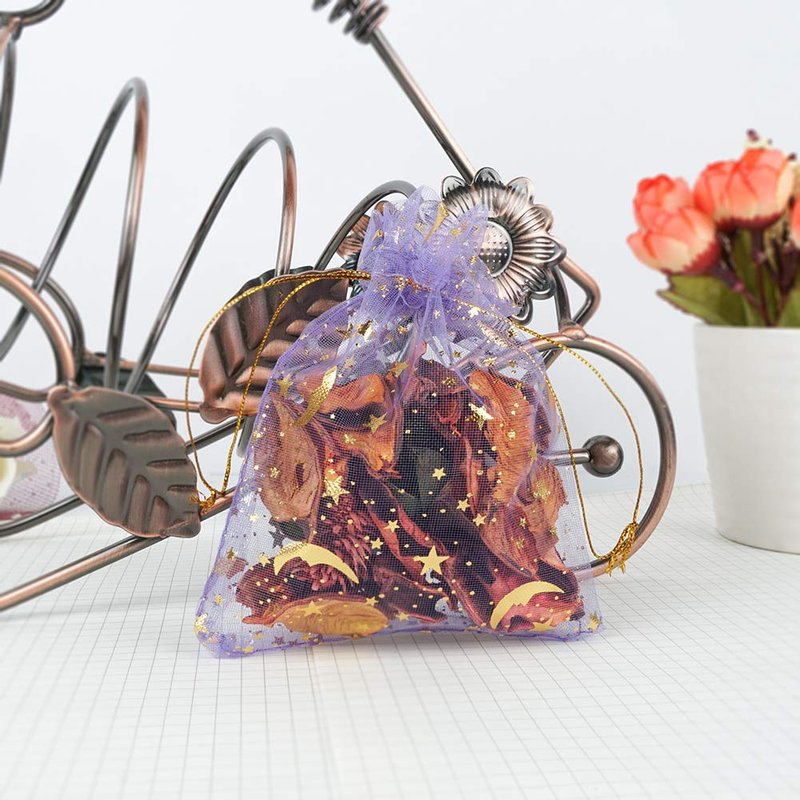 - Moon and Stars Design: Organza bags we use the design of hot stamping, which makes the moon and stars pattern becomes very conspicuous, hot stamping this practice so that the stars and moon pattern will not easily fall off, can be used for a very long time, whether it is used to give friends or their own use will be a very suitable bag.