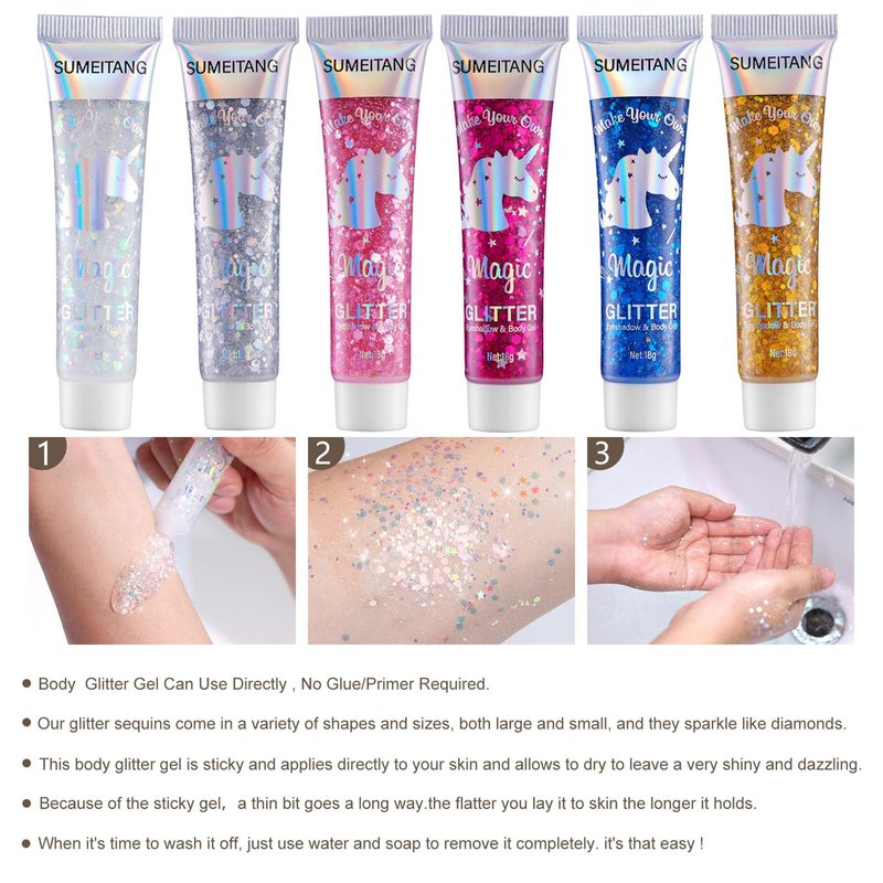 - 【6 Colors Body Glitter Gel Available】Our holographic body glitter are rich in 6 colors available:White,Silver,Gold,Pink,Blue,Red. very shiny and dazzling, and every Angle of the glitter is a different color, like a chameleon. and will show different effects under bright and dim lights. when the lights are bright, skin glitter are beautiful and shiny.when the lights are low, skin glitter also has a shimmering effect, which will make your skin sparkle in the dark and add to your charm