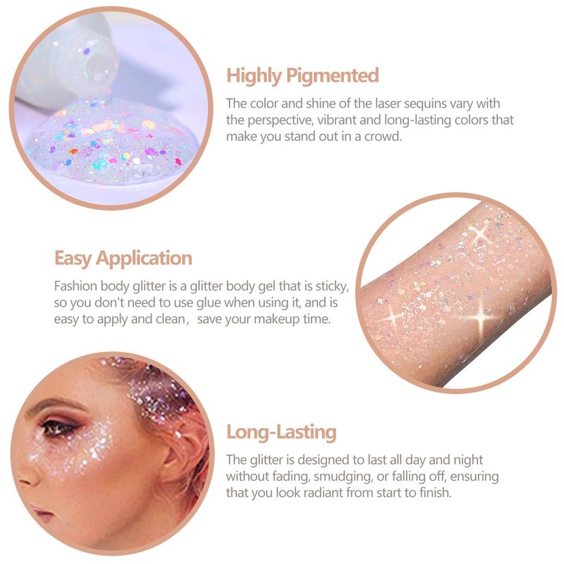 - 【Easy to Apply】Fashion Body Glitter is a glitter body gel that is sticky, so you don't need to use glue when using it, Apply the face gems glitter gel directly onto your skin, spread it with your fingertips, and let it dry for a moment. leaving sparkling and maintaining your highlight moment, making you the brightest presence in the crowd