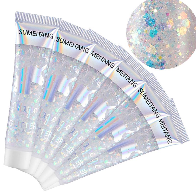 SUMEITANG 6PCS Clear White Face Body Glitter Gel,Mermaid Holographic Sequins Chunky Glitter Paint for Party Singer Concerts Festival Rave Accessories for Girls Women Face Body Hair Sparkling Makeup
