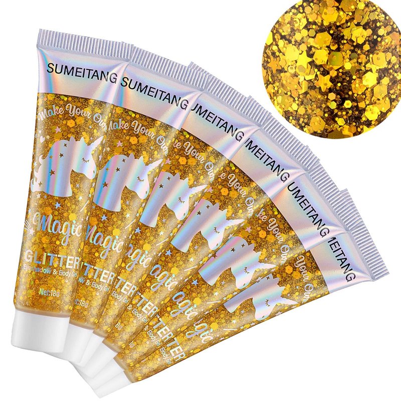 SUMEITANG 6PCS Gold Face Body Glitter Gel,Holographic Chunky Sequins Body Glitter Paint for Party Singer Concerts Music Festival Rave Accessories for Girls Women Face Body DIY Sparkling Makeup